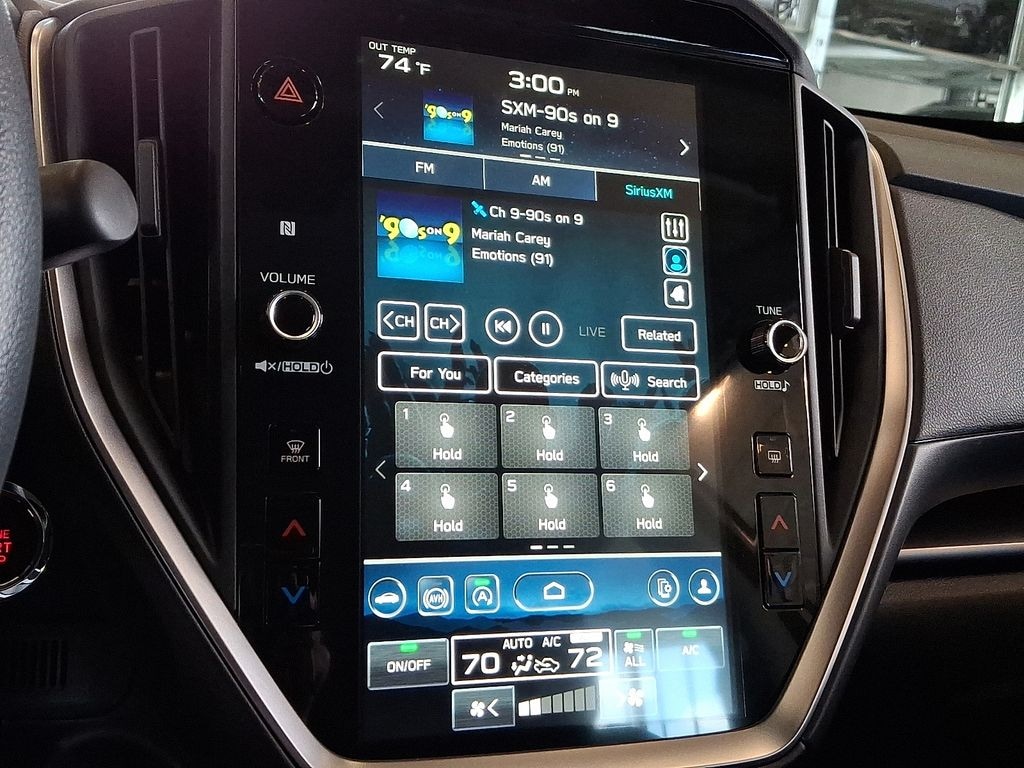 4-Wheel Disc Brakes, 6 Speakers, ABS brakes, Air Conditioning, Alloy wheels, AM/FM radio: SiriusXM with 360L, Anti-whiplash front head restraints, Auto High-beam Headlights, Auto-Dimming Exterior Mirror w/Approach Light, Auto-Dimming Mirror w/Compass & HomeLink, Automatic temperature control, Brake assist, Bumpers: body-color, Driver door bin, Driver vanity mirror, Dual front impact airbags, Dual front side impact airbags, Electronic Stability Control, Emergency communication system, Exterior Parking Camera Rear, Four wheel independent suspension, Front anti-roll bar, Front Bucket Seats, Front Center Armrest, Front dual zone A/C, Front fog lights, Front reading lights, Fully automatic headlights, Illuminated entry, Knee airbag, Low tire pressure warning, Occupant sensing airbag, Outside temperature display, Overhead airbag, Overhead console, Panic alarm, Passenger door bin, Passenger vanity mirror, Power door mirrors, Power steering, Power windows, Premium Sport Cloth Upholstery, Radio data system, Radio: Subaru 11.6" Multimedia Plus System, Rear anti-roll bar, Rear seat center armrest, Rear window defroster, Rear window wiper, Remote keyless entry, Security system, Speed control, Speed-sensing steering, Split folding rear seat, Spoiler, Standard Model, Steering wheel mounted audio controls, Tachometer, Telescoping steering wheel, Tilt steering wheel, Traction control, Trip computer, Turn signal indicator mirrors, Variably intermittent wipers, Wheels: 18" x 7.0" J Machine Finish Aluminum-Alloy.