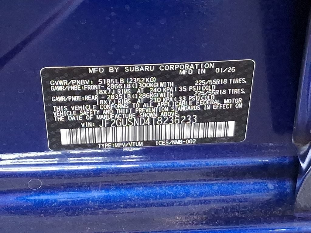 2.5L 4-Cylinder DOHC 16V, 10 Speakers, 360 Surround View Monitor, 4-Wheel Disc Brakes, ABS brakes, Air Conditioning, Alloy wheels, AM/FM radio: SiriusXM, Anti-whiplash front head restraints, Auto High-beam Headlights, Auto-Dimming Exterior Mirror with Approach Light, Auto-Dimming Mirror with Compass and HomeLink, Automatic temperature control, Brake assist, Bumpers: body-color, Compass, Crosstrek Mirror Package, Driver door bin, Driver vanity mirror, Dual front impact airbags, Dual front side impact airbags, Electronic Stability Control, Emergency communication system: MySubaru Companion (5-years free), Exterior Parking Camera Rear, Four wheel independent suspension, Front anti-roll bar, Front Bucket Seats, Front Center Armrest, Front dual zone A/C, Front fog lights, Front reading lights, Fully automatic headlights, harman/kardon® Speakers, Heated door mirrors, Heated Front Bucket Seats, Heated front seats, Heated steering wheel, Illuminated entry, Knee airbag, Leather Shift Knob, Leather steering wheel, Low tire pressure warning, Navigation System, Occupant sensing airbag, Outside temperature display, Overhead airbag, Overhead console, Panic alarm, Passenger door bin, Passenger vanity mirror, Perforated StarTex Upholstery, Power door mirrors, Power driver seat, Power Moonroof, Power Moonroof and Surround View Monitor, Power steering, Power windows, Radio data system, Radio: Subaru 11.6" Multimedia Navigation System, Rear anti-roll bar, Rear seat center armrest, Rear side impact airbag, Rear window defroster, Rear window wiper, Remote keyless entry, Security system, Speed control, Speed-sensing steering, Splash Guards, Split folding rear seat, Spoiler, Steering wheel mounted audio controls, Tachometer, Telescoping steering wheel, Tilt steering wheel, Traction control, Trip computer, Turn signal indicator mirrors, Variably intermittent wipers, Wheels: 18" x 7.0" J Dark Gray Aluminum-Alloy, 2.5L 4-Cylinder DOHC 16V.