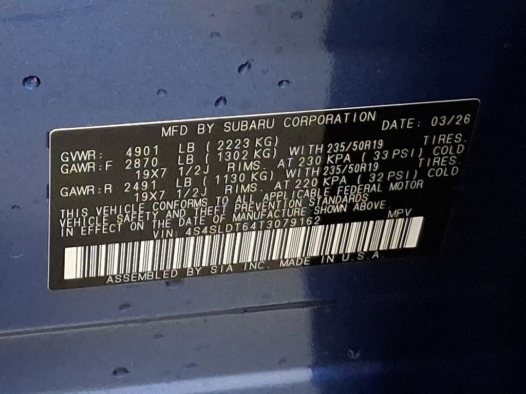 11 Speakers, 4-Wheel Disc Brakes, ABS brakes, Air Conditioning, Alloy wheels, AM/FM radio: SiriusXM with 360L, Anti-whiplash front head restraints, Auto High-beam Headlights, Auto-Dimming Exterior Mirror with Approach Light, Automatic temperature control, Brake assist, Bumpers: body-color, Driver door bin, Driver vanity mirror, Dual front impact airbags, Dual front side impact airbags, Electronic Stability Control, Emergency communication system: MySubaru Companion (5-years free), Exterior Parking Camera Rear, Four wheel independent suspension, Front anti-roll bar, Front Bucket Seats, Front Center Armrest, Front dual zone A/C, Front fog lights, Front reading lights, Fully automatic headlights, harman/kardon® Speakers, Heads-Up Display, Heated and Ventilated Front Bucket Seats, Heated door mirrors, Heated front seats, Heated rear seats, Heated steering wheel, HVAC memory, Illuminated entry, Knee airbag, Leather Shift Knob, Leather steering wheel, LED Upgrade, Low tire pressure warning, Memory seat, Navigation System, Occupant sensing airbag, Outside temperature display, Overhead airbag, Overhead console, Panic alarm, Passenger door bin, Passenger vanity mirror, Perforated Leather-Trimmed Upholstery, Power door mirrors, Power driver seat, Power Liftgate, Power moonroof: Panoramic, Power passenger seat, Power steering, Power windows, Radio data system, Radio: Subaru 11.6" Multimedia Navigation System, Rain sensing wipers, Rear anti-roll bar, Rear Bumper Cover, Rear seat center armrest, Rear window defroster, Rear window wiper, Remote keyless entry, Security system, Speed control, Speed-sensing steering, Splash Guards, Split folding rear seat, Spoiler, Standard Model, Steering wheel mounted audio controls, Tachometer, Telescoping steering wheel, Tilt steering wheel, Traction control, Trip computer, Turn signal indicator mirrors, Variably intermittent wipers, Ventilated front seats, Wheels: 19" x 7.5 J Dark Gray Aluminum-Alloy.